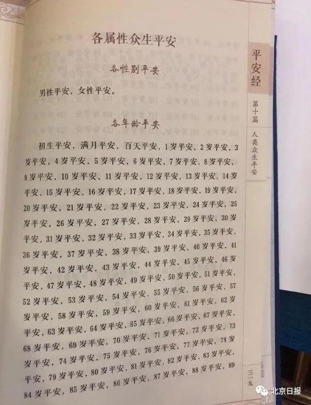 奇书共欣赏,这个《平安经》真的让人大开眼界,书的内容大致如下:“1岁平安,2岁平安……,99岁平安”;“眼平安,耳平安,鼻平安……”;“口部平安,牙齿平安,舌平安……”;“北京火车站平安,西安火车站平安,郑州火车站平安……”;“中华人民共和国平安,阿富汗平安,阿拉伯联合国平安……”! }+ z1 A" p, F/ Z, @9 l- a