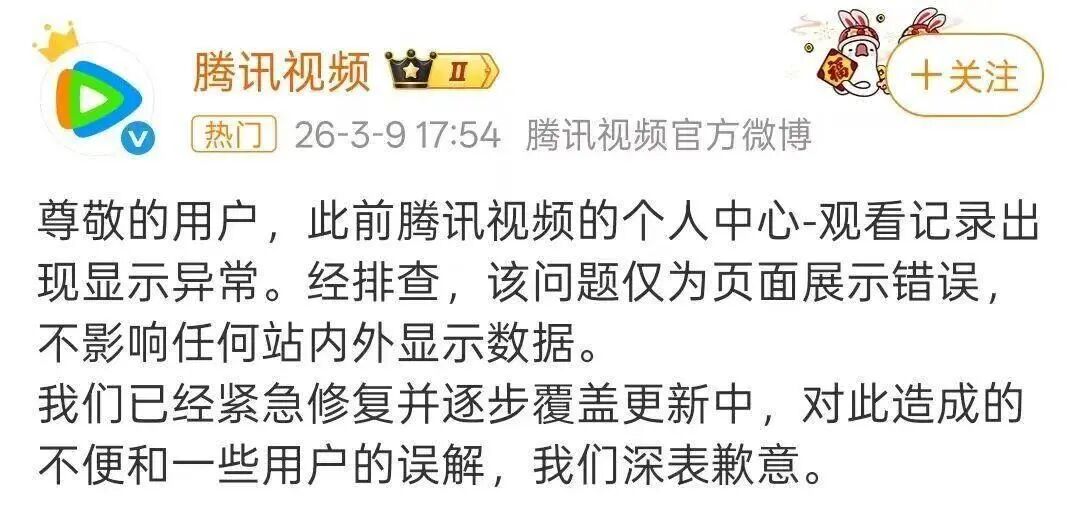 8 e0 O( c3 G' l! `2 P' ?2 }9 H腾讯视频很快就做出了回应,他们说这是BUG,只是显示错误,不会影响统计。 / b5 X/ q: E* K9 ~8 a3 U( j