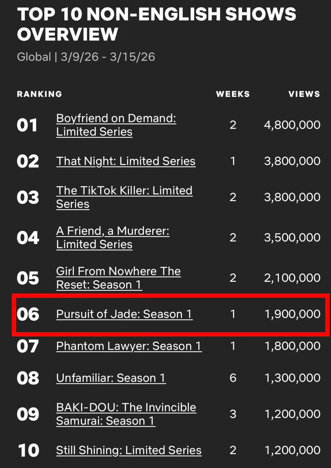 ; e. n! S: _$ b' o0 Z不光国内热度拉满,听说还爆到了海外,登上网飞非英剧榜单的周榜第六。
