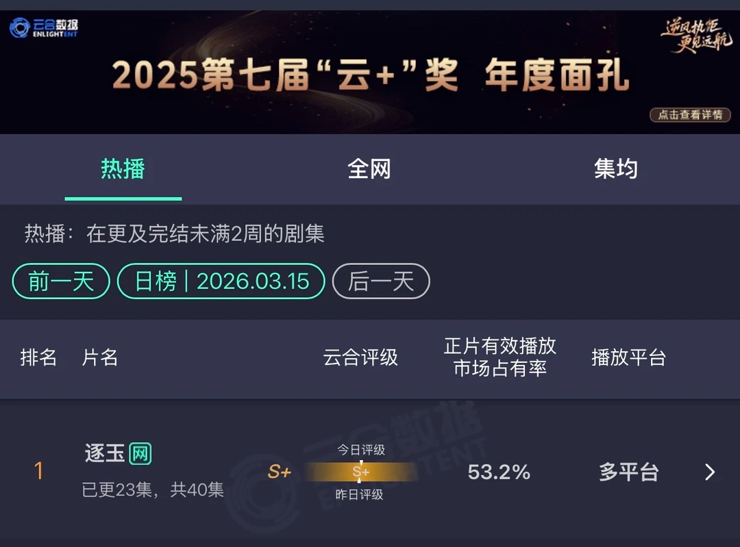 315当天,《逐玉》播到23集,剧情过半,云合占有率也过半,高达53.2%,仅次于2023年的《狂飙》和2024年的《庆余年2》。