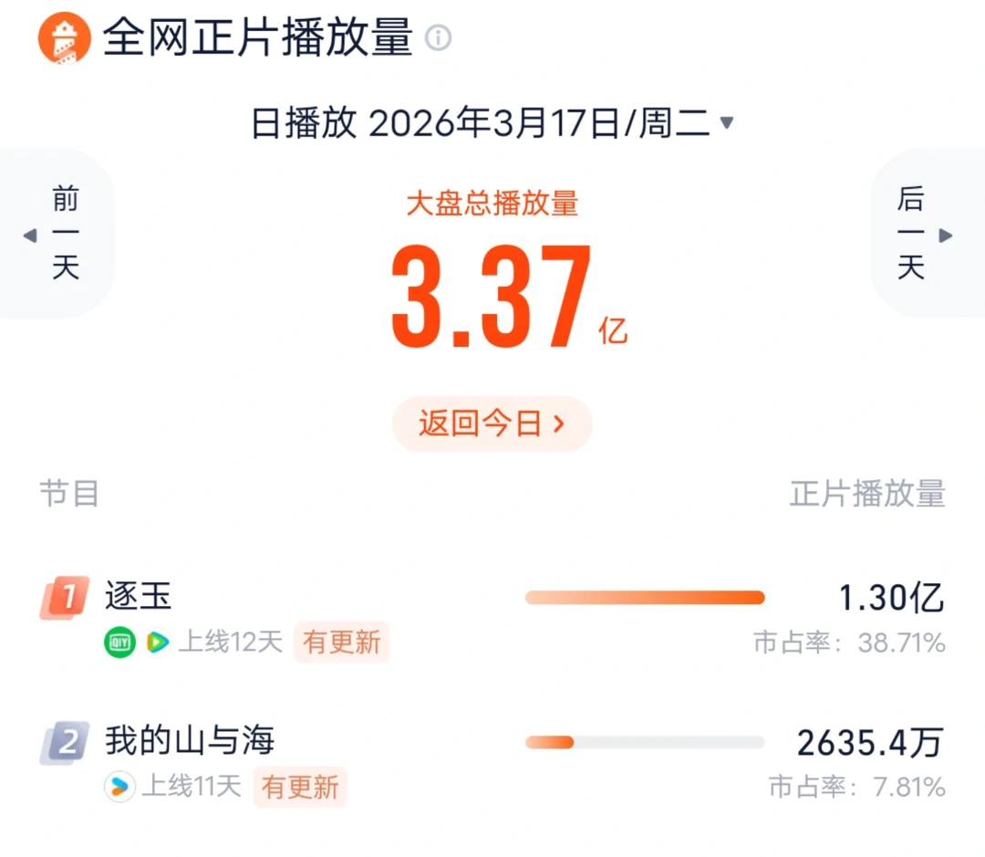 还有数据显示,这剧现在的单日全网播放量在1.3亿,第二名连它的零头都不到。
